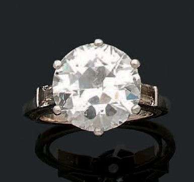 Bague en platine (950) sertie d'un diamant demi taille épaulé de deux diamants baguettes.