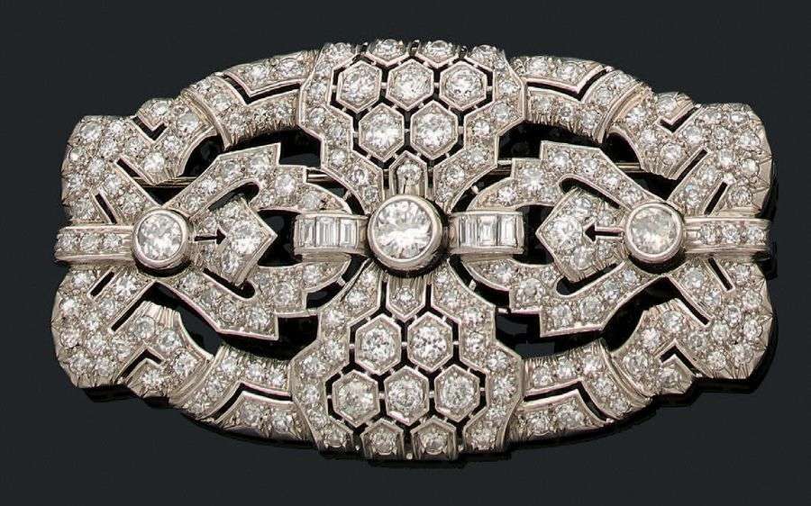 Broche «plaque» en platine (950) et or gris 18k (750) à décor repercé serti de diamants de taille ancienne et rehaussée au centre de trois diamants plus importants et deux barrettes de diamants de taille baguette.