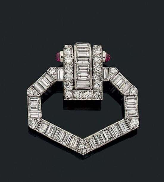 Clip de revers "écusson" en platine (950) et or gris 18K (750) serti de lignes de diamants de tailles baguette et brillant.