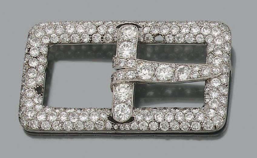 A platinum and white gold "belt buckle" brooch set with diamonds. 2 diamonds are missing.