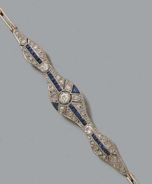 Bracelet articulé en or jaune et gris 18K (750) et platine (950) serti de diamants de taille ancienne, de diamants taillés en rose et de saphirs calibrés.