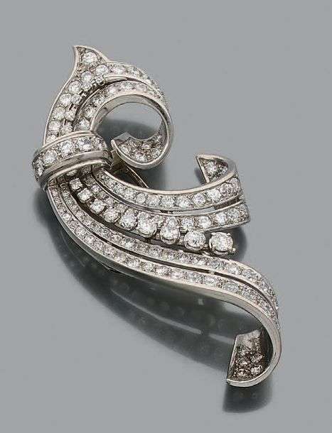 Grand clip "volute" en platine (950) serti de lignes de diamants de taille brillant et de taille ancienne. Vers 1950