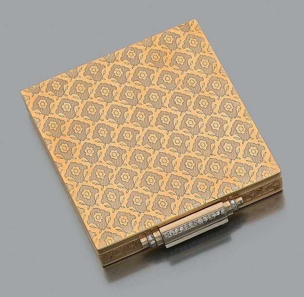 Poudrier rectangulaire en or jaune 18K (750) ciselé d'un décor de fleurs. Beau fermoir en or gris 18k (750) serti de lignes de diamants de taille ancienne. Signé
