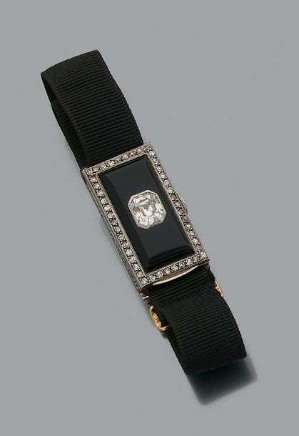 A platinum and onyx watch set with diamonds.
