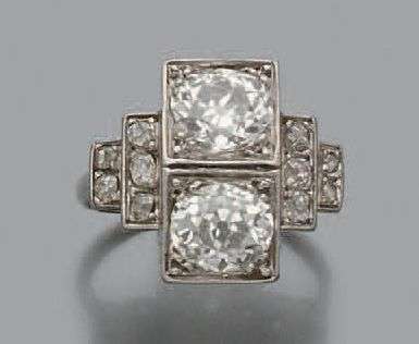 Bague en platine (950) sertie de deux diamants de taille ancienne épaulés de deux rangs de diamants de taille ancienne et de diamants taillés en rose.