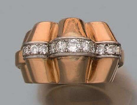 Importante bague en or rose 18K (750) de forme bombée et rehaussée d'un ruban central serti de diamants. Vers 1940