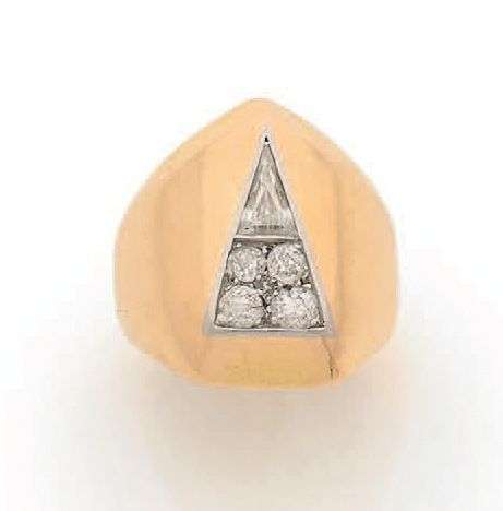 Large bague en platine (950) et or jaune 18k (750) à motif triangulaire serti d'un diamant triangle et de diamants de taille ancienne.