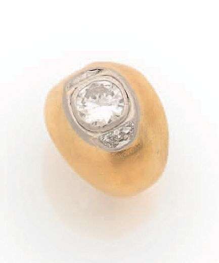 Bague boule légèrement facettée en platine (950) et or jaune 18k (750) sertie d'un diamant demi taille épaulé de deux diamants demi lune.