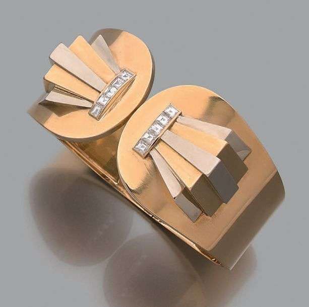 Bracelet jonc en or 18K (750) orné de deux motifs à gradins en or jaune et gris 18k (750) rehaussés d'une ligne de diamants calibrés. Vers 1940