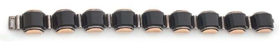 Bracelet articulé en or jaune 18k (750) et argent (<800) composé de motifs cylindriques ornés d'onyx. Les bords extérieurs sont rehaussés d'un demidisque en or jaune. Fermoir intégré dans un maillon. Vers 1930-35.