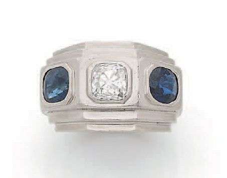 Bague chevalière à pans en platine (950) sertie d'un diamant de taille ancienne épaulé de deux saphirs.