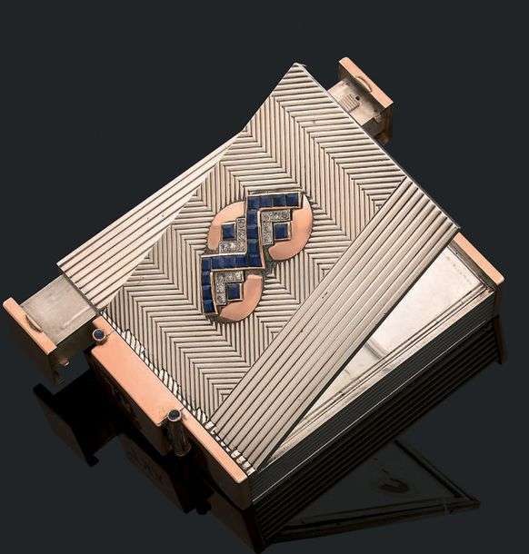 Minaudière rectangulaire en argent (<800) et or rose 18K (750) composée d'un briquet, d'un étui à lèvres, d'un peigne en écaille, d'un poudrier et d'une montre.