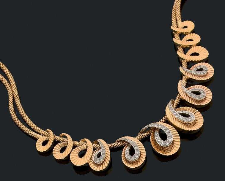 Collier en or jaune 18K (750) et platine (950) composé de deux liens souples ornés de boucles ciselées réhaussées de lignes de diamants pour celles du centre.