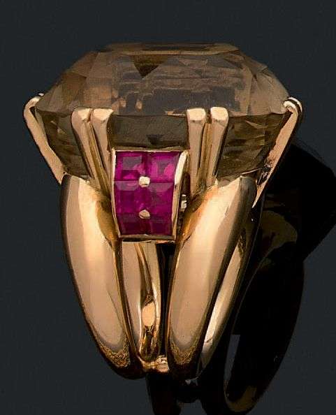 A yellow gold ring set with an importante citrine between rubies. Circa 1950.
