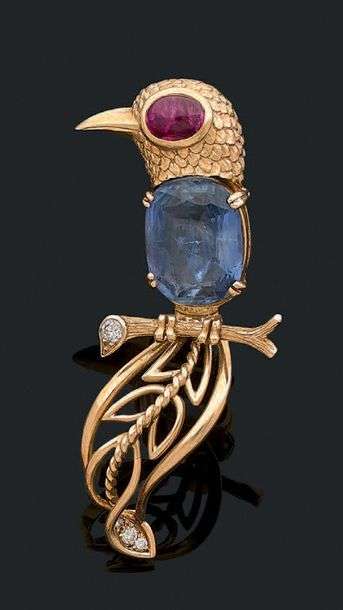 Clip " oiseau sur une branche" en or jaune 18K (750) ciselé et serti sur le corps d'un important saphir ovale, pour l'oeil d'un cabochon de rubis et de brillants.