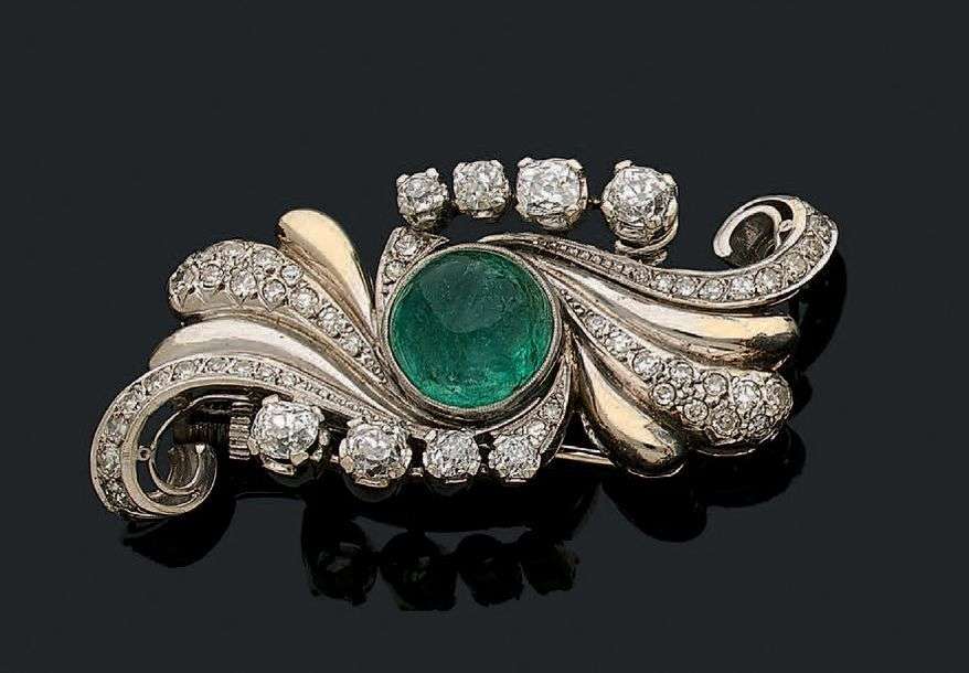 A white gold brooch set with an emerald cabochon enhanced by diamonds.