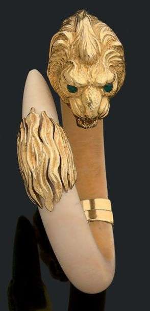 Bracelet jonc à ouverture latérale en ivoire et or jaune 18k (750) ciselé d'une tête de lion. Travail français