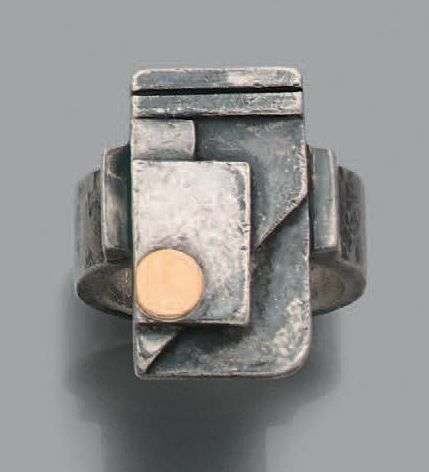 Bague en argent (<800) martelé, de forme rectangulaire à décor de lignes, rectangles et d'une sphère en or jaune 18K (750).