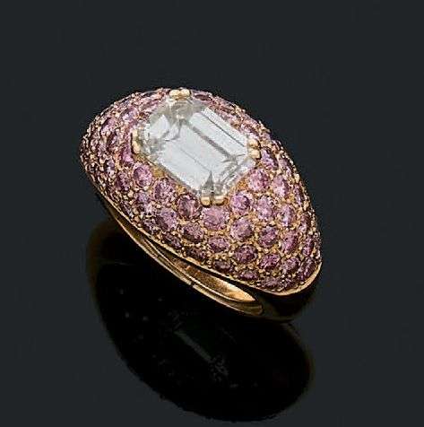 A yellow gold ring set with an important diamond paved by pink diamonds.