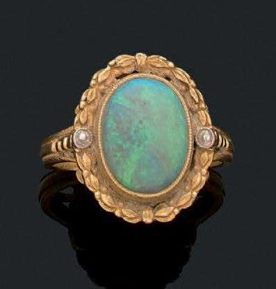 Bague en or jaune 18K (750) ornée d'une opale dans un entourage en or jaune ciselé rehaussé de deux diamants taillés en rose.