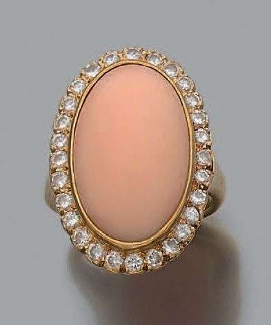 Bague en or jaune 18K (750) sertie d'un cabochon de corail dans un entourage de diamants.