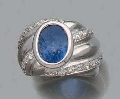 Bague "jonc" en or gris 18K (750) sertie au centre d'un pavage de diamants, épaulé de deux godrons en or gris.