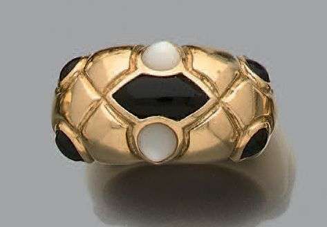 A yellow gold and black enamel ring enhanced by mother-of-pearl.