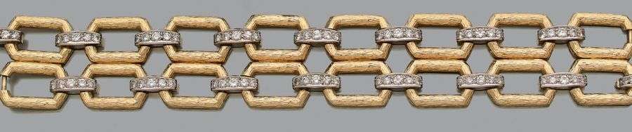 Bracelet articulé composé d'un double rang de maillons en or jaune 18K (750) entrelacés de barrettes en or gris 18k (750) serties de diamants de taille brillant.