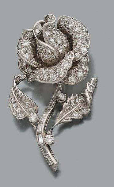 Clip "rose" en platine (950) et or gris 18K (750) serti de diamants de taille huit huit, la tige est sertie de diamants baguettes.