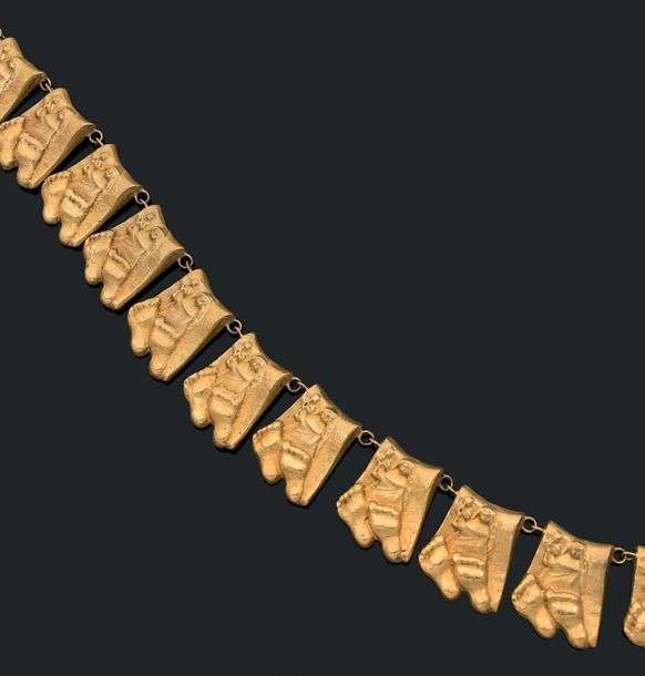 Collier articulé en bronze doré «Berthe aux grands pieds». Vers 1950-55. Signé LV.