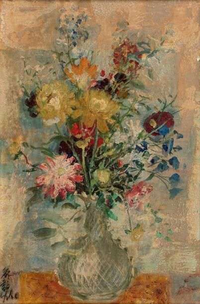 Gouache sur soie marouflée sur isorel, signée en bas à gauche