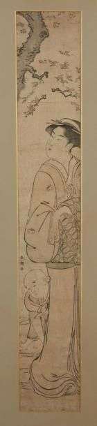 Estampe de format hashira-e représentant une jeune femme et un enfant.
