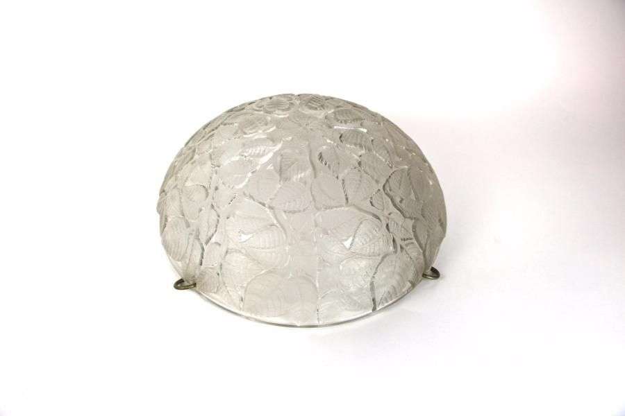 Suspension en verre moulé pressé à décor feuillagé et cache-bélière évasé.