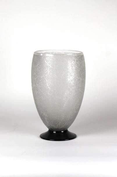 ensemble comprenant un vase ovoïde à décor nuageux dégagé à l'acide, sur un pied douche noir et un pied de lampe ovale à panse applatie à décor de fleurs violines.