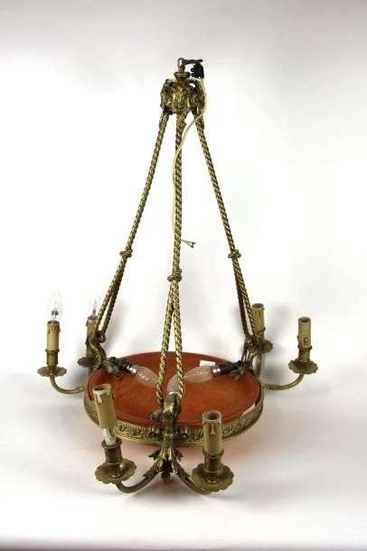 Suspension en bronze à six bras de lumière avec vasque en verre multicouche oranger