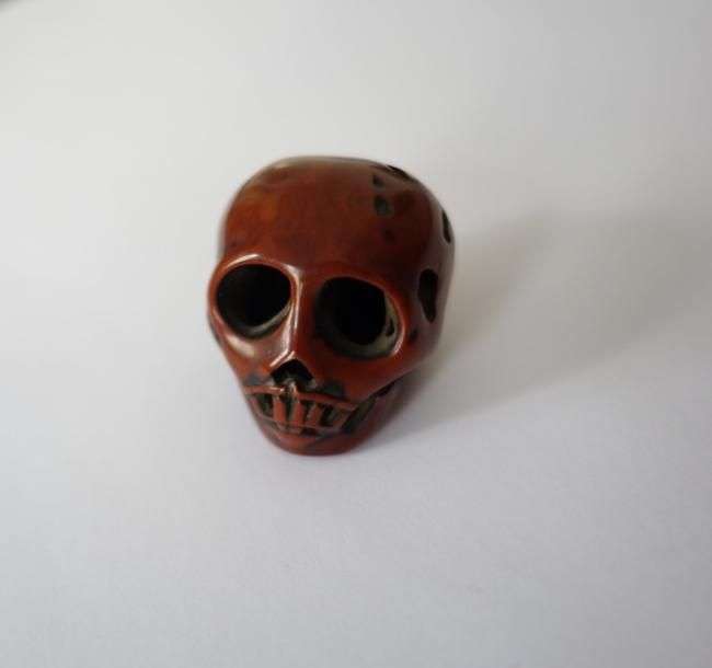 Petit netsuke ou grand ojime en bois de belle patine sculpté en forme de crâne.
