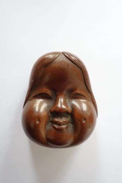 Netsuke en bois représentant un masque d'Okame. Signé Tôkô tô , «sculpté par Tôkô »