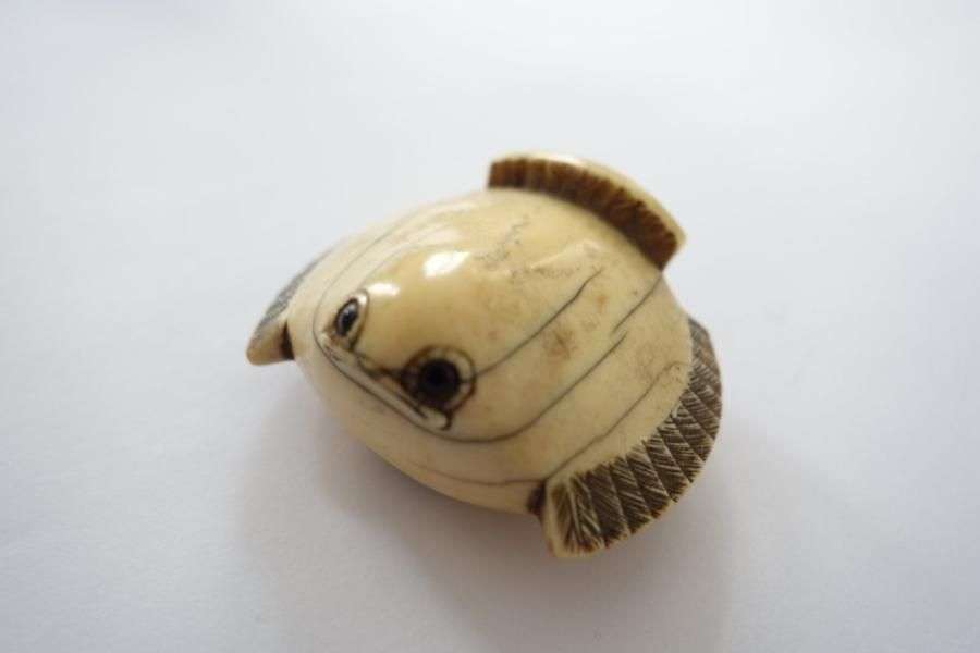 Netsuke en ivoire représentant le moineau Fukura Suzume, les yeux incrustés de corne brune. Signé Masanao. (Gerces, petite égrenure au bec)