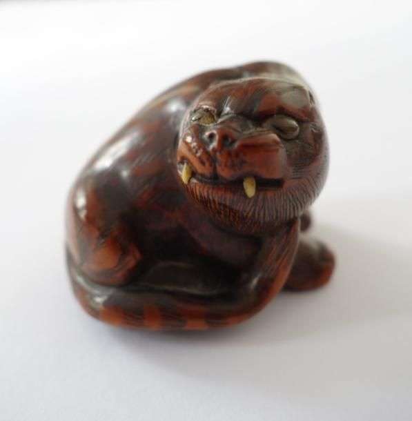 Netsuke en bois représentant un tigre assis, la tête tournée vers la droite, l'air féroce, les crocs apparents en ivoire, les yeux incrustés de corne blonde. Signé Masanao.