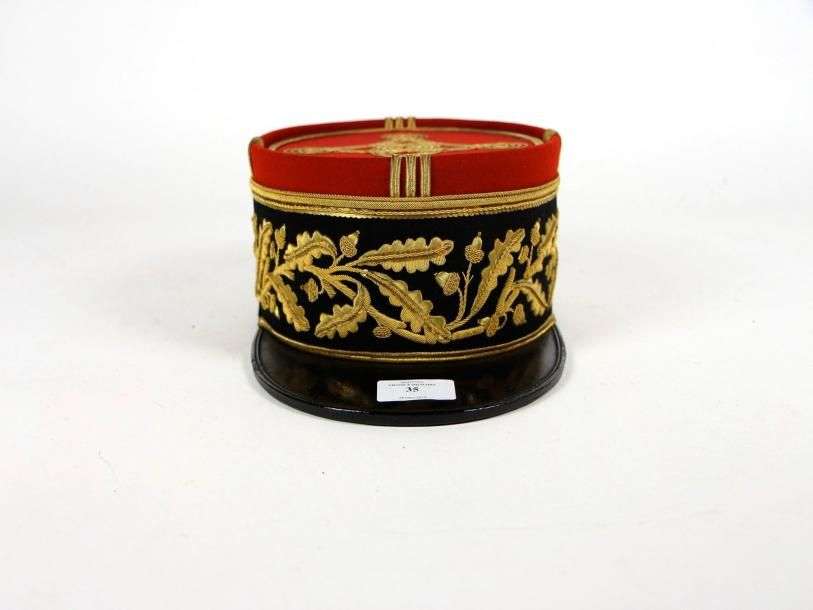 Képi de Grande tenue de Général de Brigade. Bandeau en drap noir, à broderie et galons dorés. Fond en drap rouge. Visière en cuir. Coiffe intérieure en soie et bandeau en cuir. Étiquette intérieure marquée « Gl Foissy 26-9-32 N°17520 ». Fabrication Richard. TBE