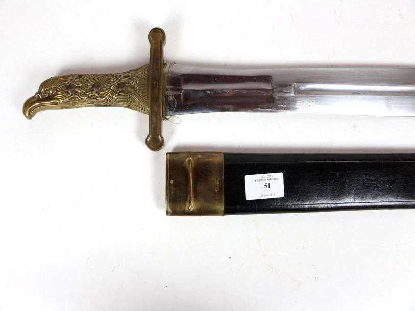 Glaive de Sapeur. Monture en laiton, ciselé. Poignée en tête d'aigle. Lame à deux tranchants et pans creux. Fourreau en cuir, à deux garnitures en laiton. BE Reproduction