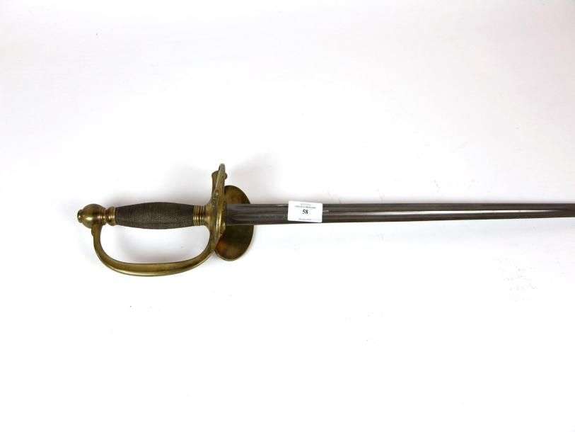 Épée de Sous-officier, modèle 1884. Fusée entièrement filigranée. Monture en laiton. Garde à une branche. Clavier à la grenade. Contre-clavier à pompe. Lame à deux tranchants et deux pans creux à la moitié. EM SF