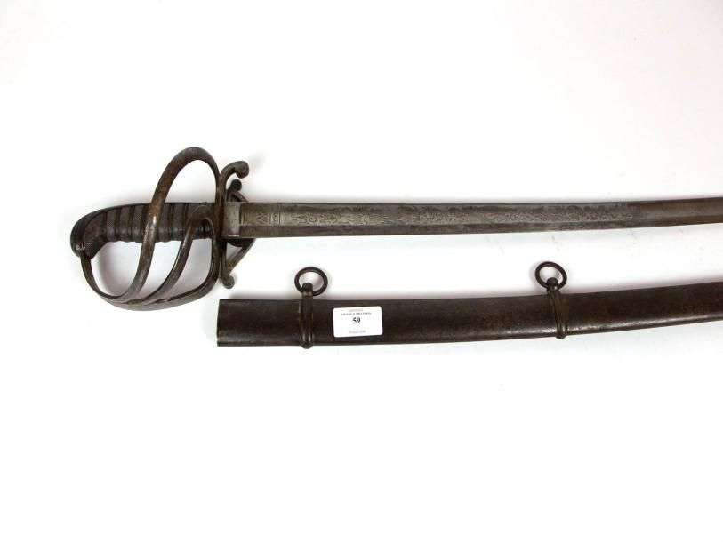 Sabre d'Officier britannique. Poignée recouverte de galuchat, avec filigrane. Monture en fer. Calotte à longue queue. Garde à trois branches. Contre-coquille rabattable. Lame courbe, à dos rond et pans creux, gravée. Fourreau à deux bracelets en fer. ABE (oxydation)