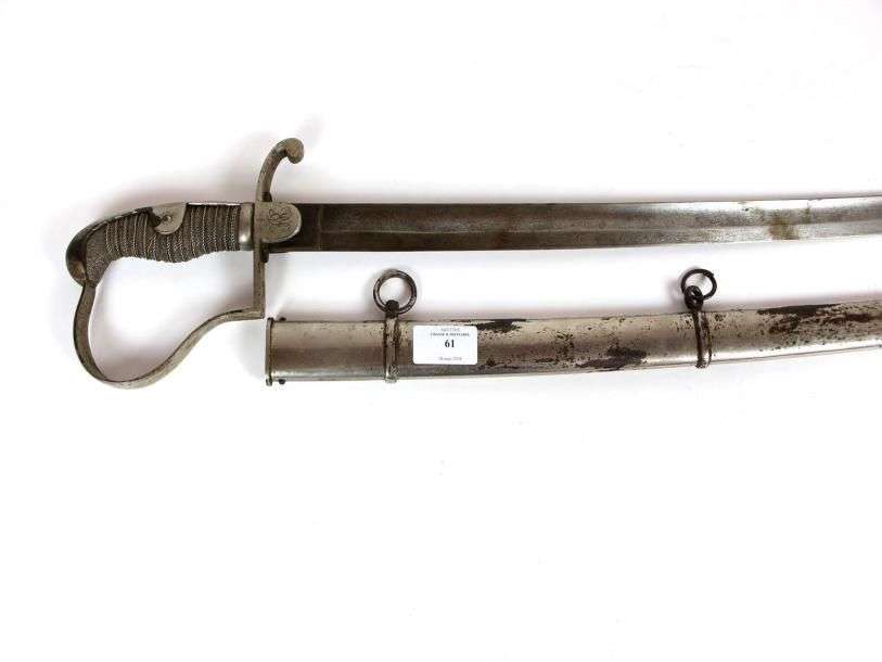 Sabre d'Officier de Cavalerie légère allemande. Poignée recouverte de galuchat, avec filigrane en argent. Monture en métal nickelé. Calotte à longue queue. Garde à une branche, à la Blücher. Lame courbe, à dos rond et pans creux, gravée. Fourreau à deux bracelets en métal nickelé. EM vers 1900 (usures, coups au fourreau)