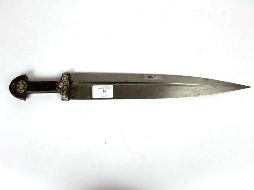 Poignard caucasien, dit kindjal. Poignée à plaquettes de corne, à deux boutons de rivures. Lame à deux tranchants, à gouttières dissymétriques. ABE SF