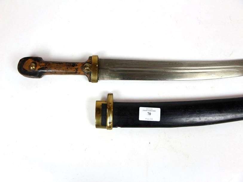 Poignard russe, dit bebout. Poignée en bois. Lame courbe, à deux tranchants et deux gouttières. Fourreau laqué, à deux garnitures en laiton. ABE Reproduction