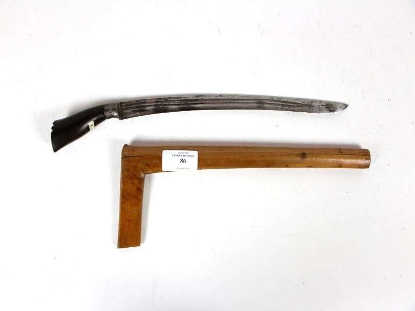 Poignard indonésien. Manche en corne. Lame courbe, à gouttières. Fourreau