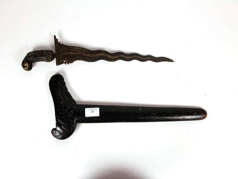 Poignard malais, dit kriss. Poignée sculptée. Lame flamboyante, à décor doré du serpent. Fourreau en bois, en partie sculpté et noirci.