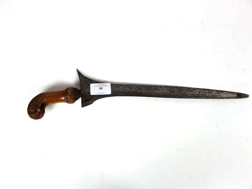 Poignard malais, dit kriss. Poignée en bois sculpté. Lame en pamor, à deux