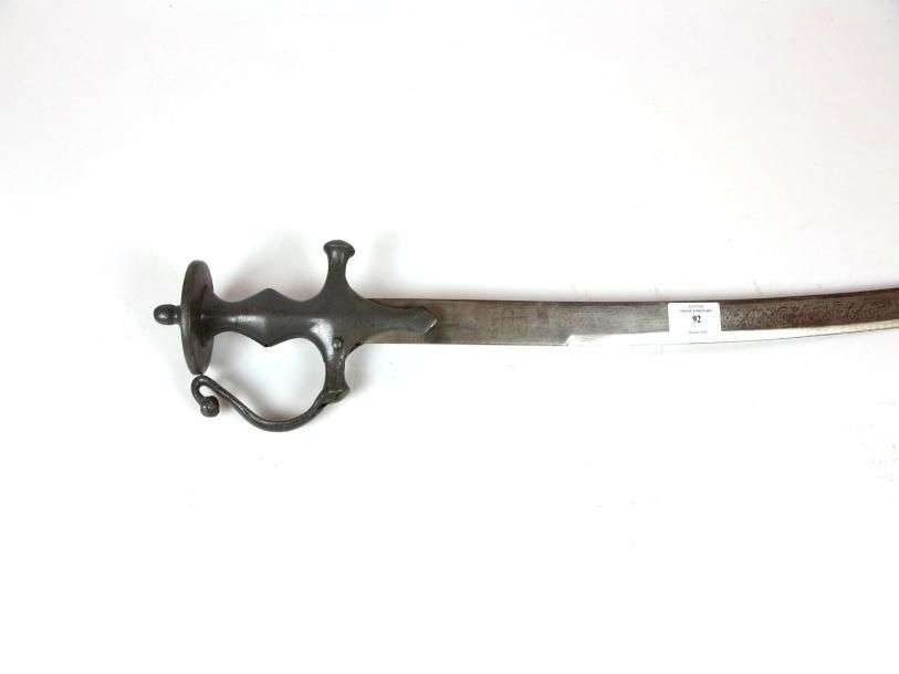 Sabre de l'Inde, dit talwar. Monture en fer. Garde à une branche. Lame courbe, décorée. Dans l'état SF